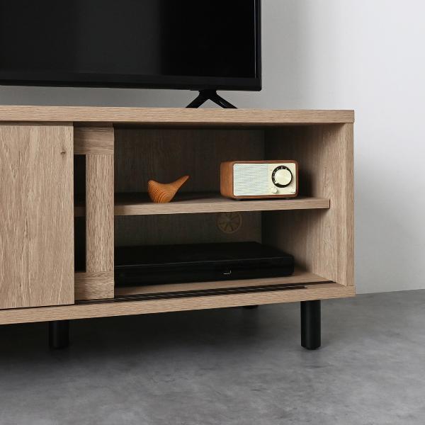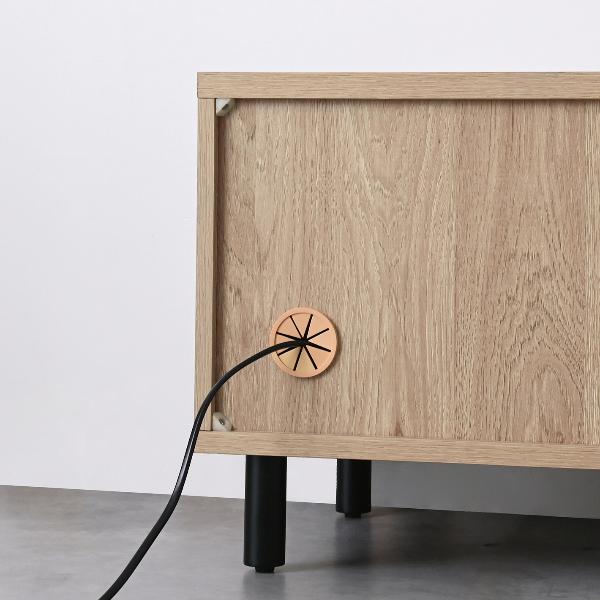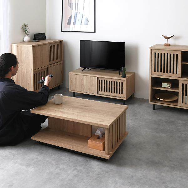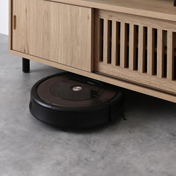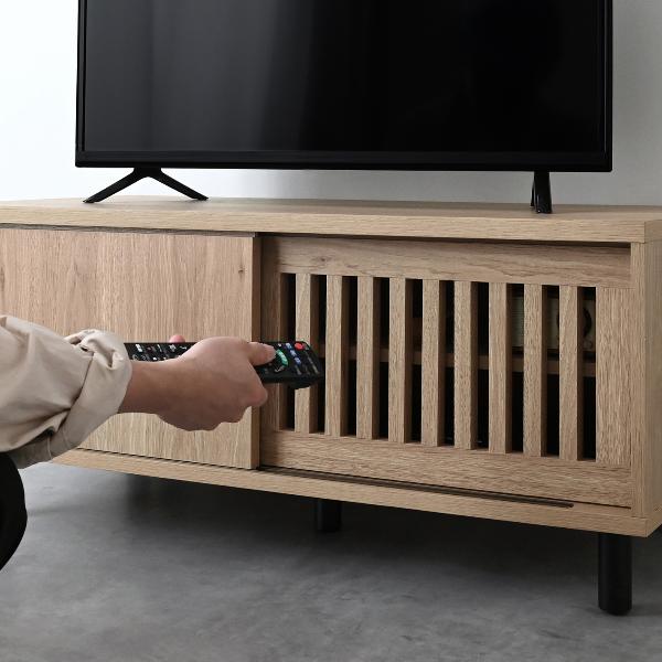 2箇所の扉内収納は、フラットな隠す収納と格子の見せる収納でリビング小物もすっきり。 格子扉は閉じたままでもリモコン操作が可能です。 脚付きなので掃除機やお掃除ロボもスムーズに使え、埃が溜まりやすいテレビ周りもすっきり快適。
