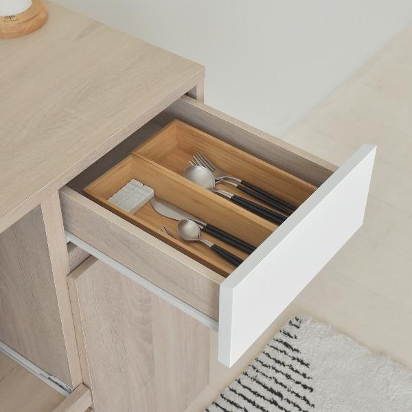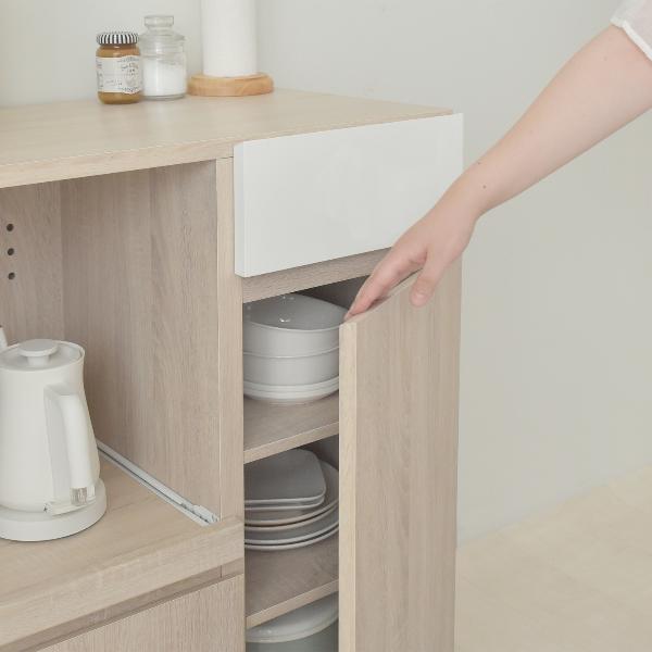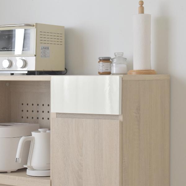 自然な木目と美しい鏡面の作り出すナチュラルな風合いが印象的な北欧テイストシリーズ。取っ手がないすっきりとしたシンプルなデザインで、北欧テイストやホワイトインテリアが好きな方におススメです。Point02便利なスライド棚