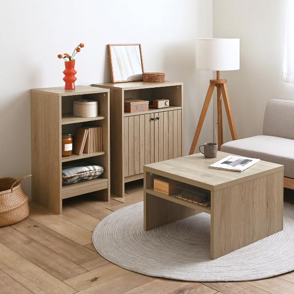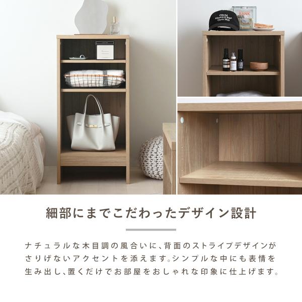 木目調の風合いに背面のストライプがアクセント。脚下10cmの空間によって印象も軽やかに、下段の物も取りやすく・掃除機もかけやすくなっています。