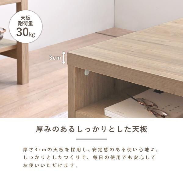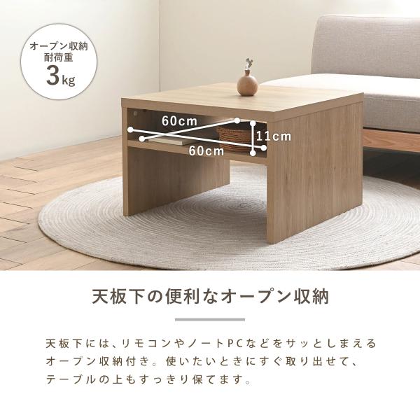 天板下には、リモコンやノートPCなどをサッとしまえるオープン収納付き。使いたいたおきにすぐ取り出せて、テーブルの上もすっきり保てます。