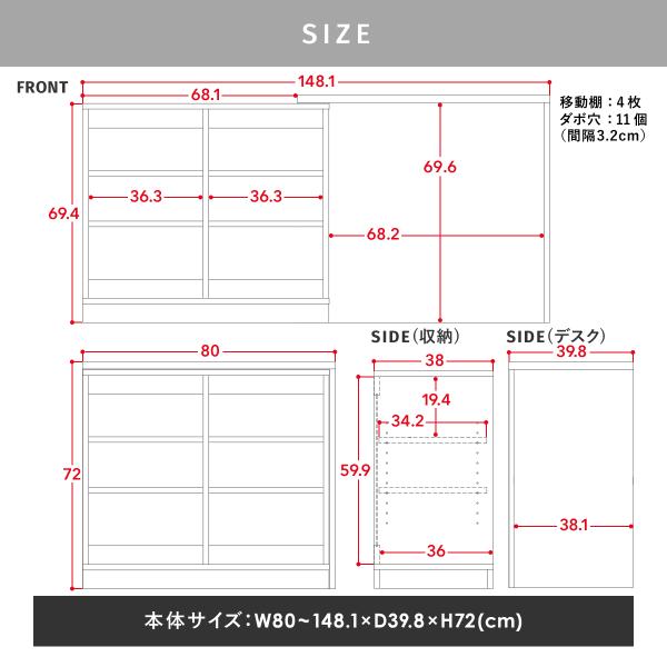 | サイズ・容量 | ■商品サイズ:(本体)W800~1481 ×D398 ×H720 mm■商品重量:(本体)29.85kg■梱包サイズ:W895×D765×H155mm■梱包重量:32.45kg★耐荷重:[天板(デスク)]10kg:[天板(収納)]20kg[移動棚]10kg | |